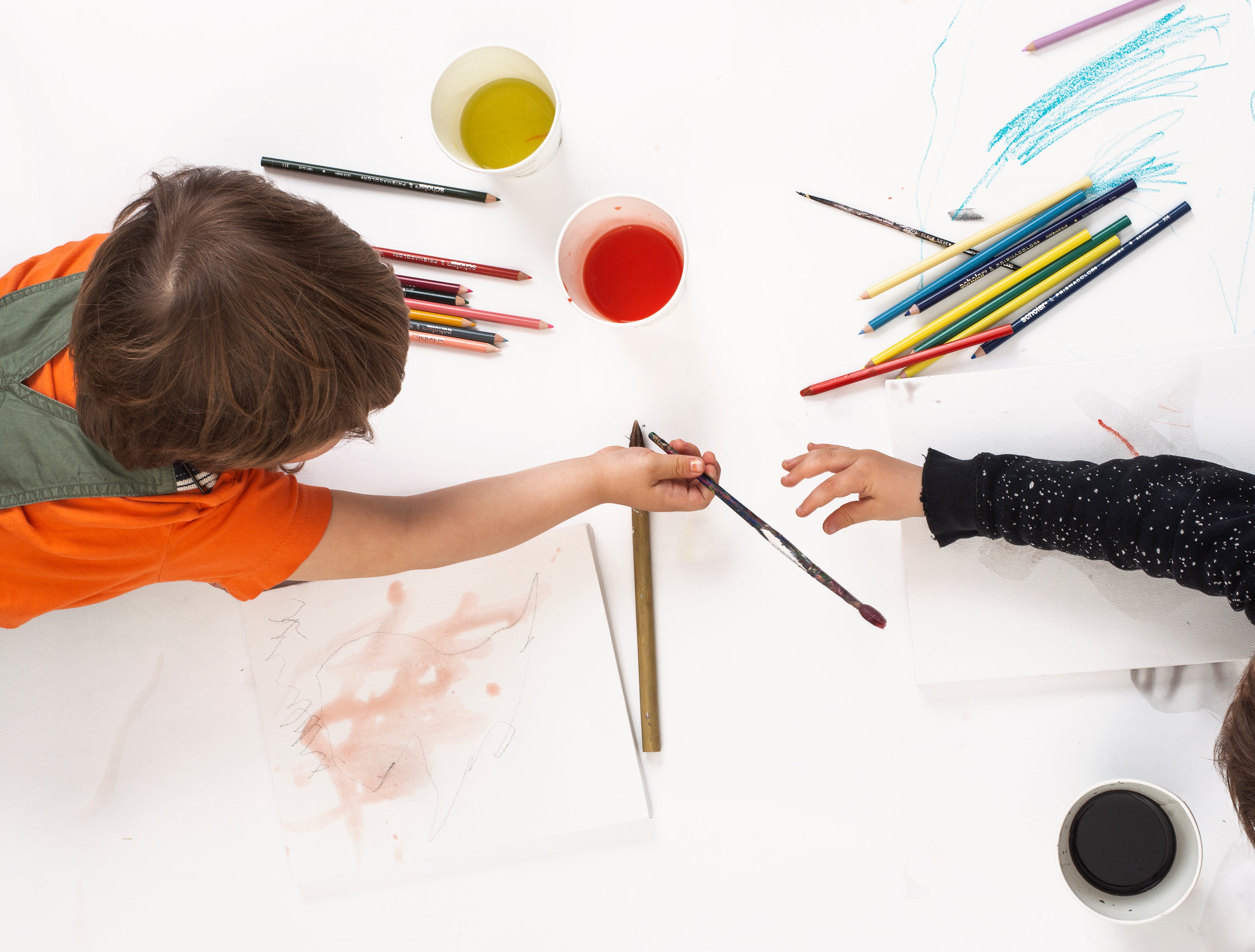 One large table permanently dedicated to drawing and coloring with various materials and activites for endless creative exploration. 4 smaller tables with specific projects rotating every week. Things like a stamp station, rock painting, construction (paper) zone, building bracelets, Seasonal Projects, STEM projects, Fresh Flower still-life painting, printmaking, fun with fabrics...and more!